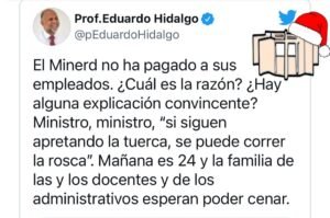 “El Minerd no ha pagado a sus empleados. ¿Cuál es la razón? ¿Hay alguna explicación convincente? Ministro, ministro, “si siguen apretando la tuerca, se puede correr la rosca”. Mañana es 24 y la familia de las y los docentes y de los administrativos esperan poder cenar”, posteó Hidalgo en su cuenta de Twitter.