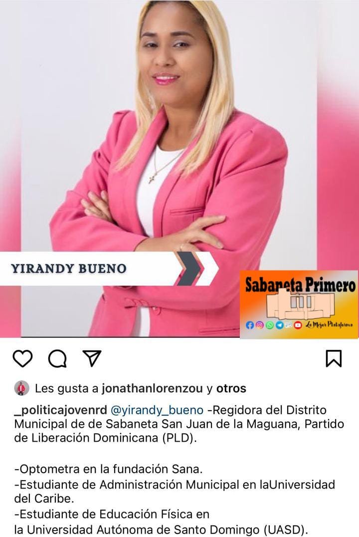 Esta plataforma de comunicación, ha seleccionado decenas de jóvenes de todo el país, que se han destacado por su trabajo, su participación en la política y la cosa pública; tal es el caso de la regidora del distrito municipal de Sabaneta, la joven, Yirandy Bueno Ferreras, quien desde el año 2020 ha representado dignamente no solo a los electores que sufragaron por ella, sino a todo este territorio.