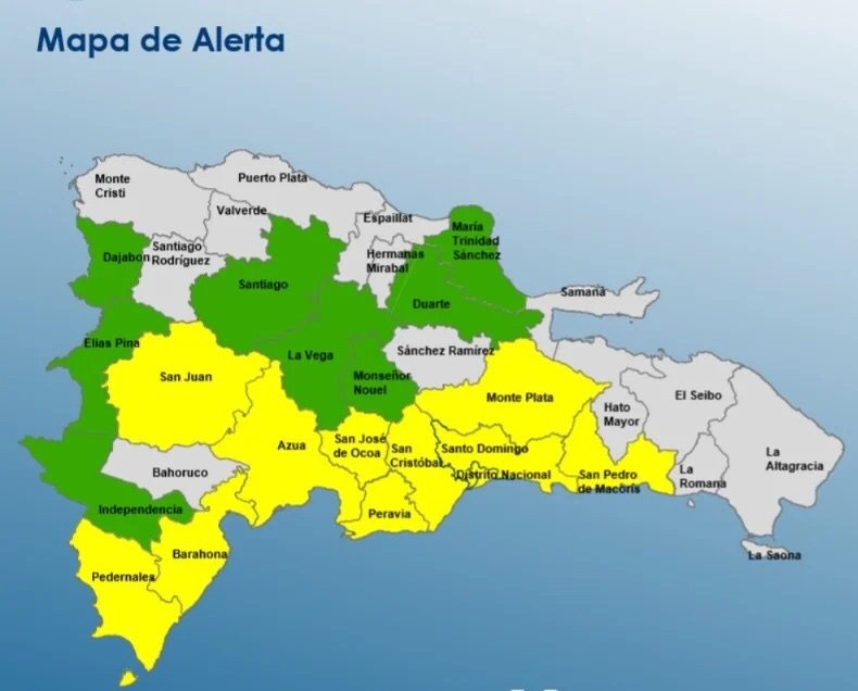 SANTO DOMINGO.-– El Centro de Operaciones de Emergencias (COE) informó este domingo que se mantienen 11 provincias en alerta amarilla y 8 en verde debido al riesgo de inundaciones repentinas urbanas y rurales, crecidas de ríos, arroyos y cañadas, así como deslizamientos de tierra, producto de las condiciones de humedad que persisten sobre gran parte del territorio nacional.