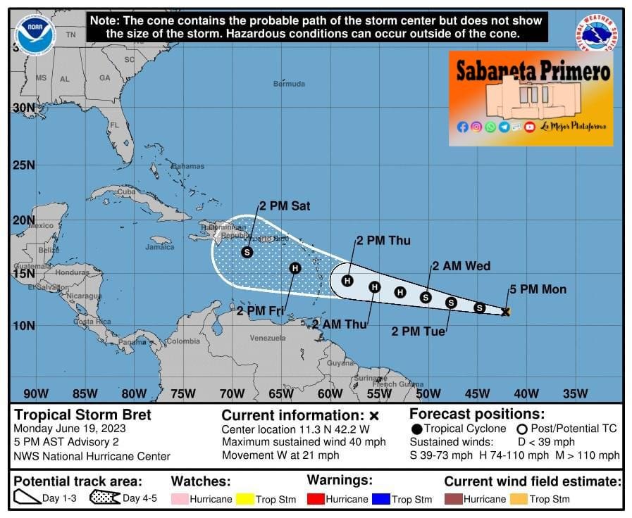 Sobre el trayecto pronosticado, Bret, debe estar acercándose a las Antillas Menores a finales de esta semana.La actual temporada de huracanes, que se prevé tendrá un número promedio de ciclones, comenzó el pasado 1 de junio en la cuenca atlántica y termina el próximo 30 de noviembre.