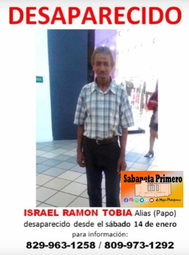 Hombre Está desaparecido el señor Ramón Israel Tibia, Papo, desde el sábado pasado. Residente en El Almirante, tiene familiares en San Juan. 3 años hace Santo Domingo, RD- Está desaparecido el señor Ramón Israel Tibia, Papo, desde el sábado pasado. Residente en El Almirante, Santo… Se encuentra desaparecido delivery salió de trabajo a medianoche del lunes 3 años hace Adonis Vargas salió del colmado donde trabaja en Villa Mella con destino a Cristo Rey Josefina Medina Santo Domingo -…