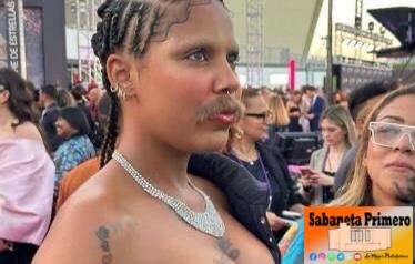 Luciendo un traje negro y un bigote rubio, así llego la cantante urbana dominicana a la alfombra magenta de Premio Lo Nuestro 2023, donde está nominada a los renglones Artista Revelación Femenina y Artista Femenina del Año–Urbano.
