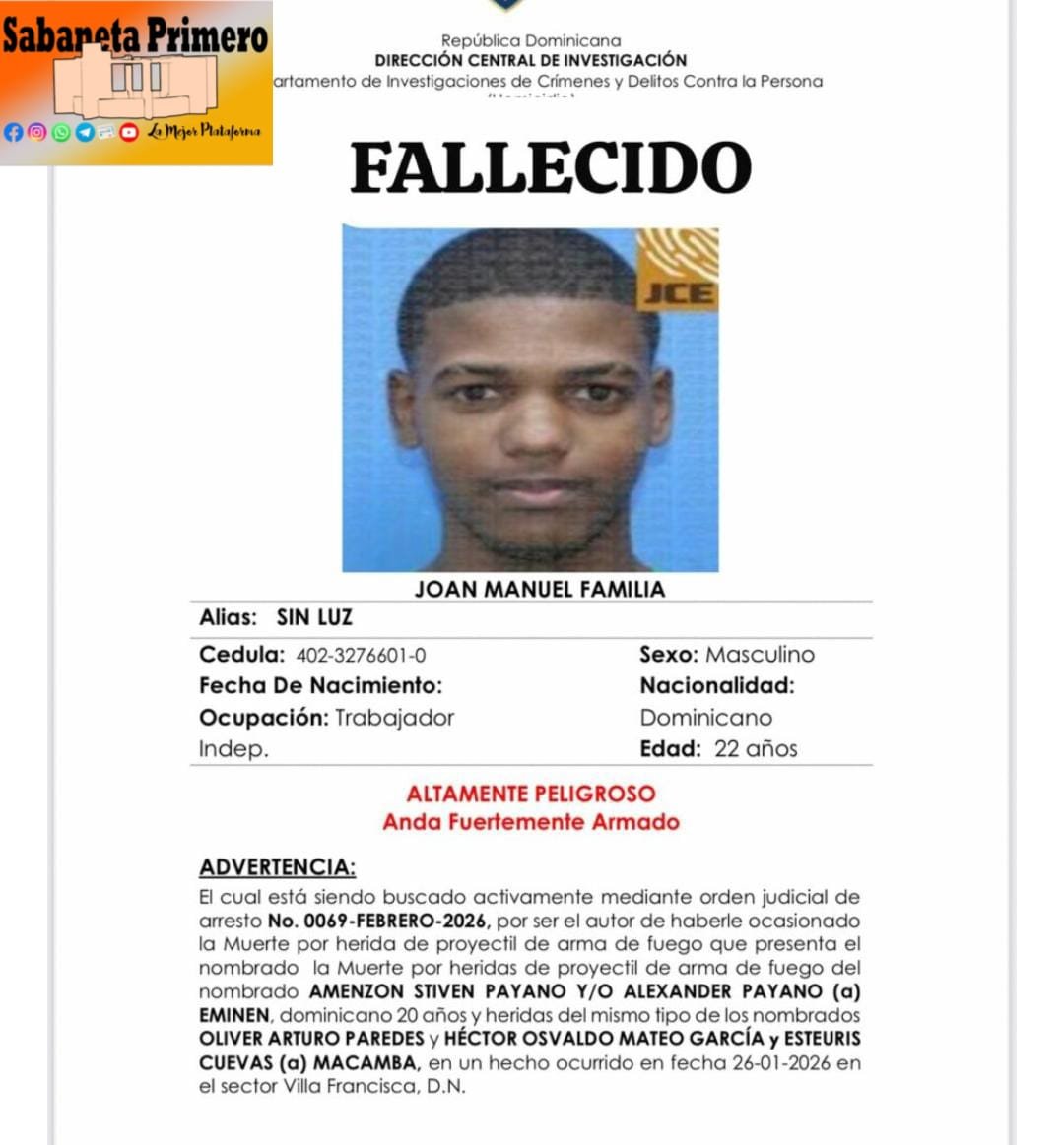 Se trata de Johan Manuel Familia, “Sin Luz”, quien tenía en su contra la orden de arresto No. 0067-FEBRERO-2026 por su presunta implicación en un homicidio, varias tentativas de homicidio y otros delitos registrados en el Distrito Nacional.