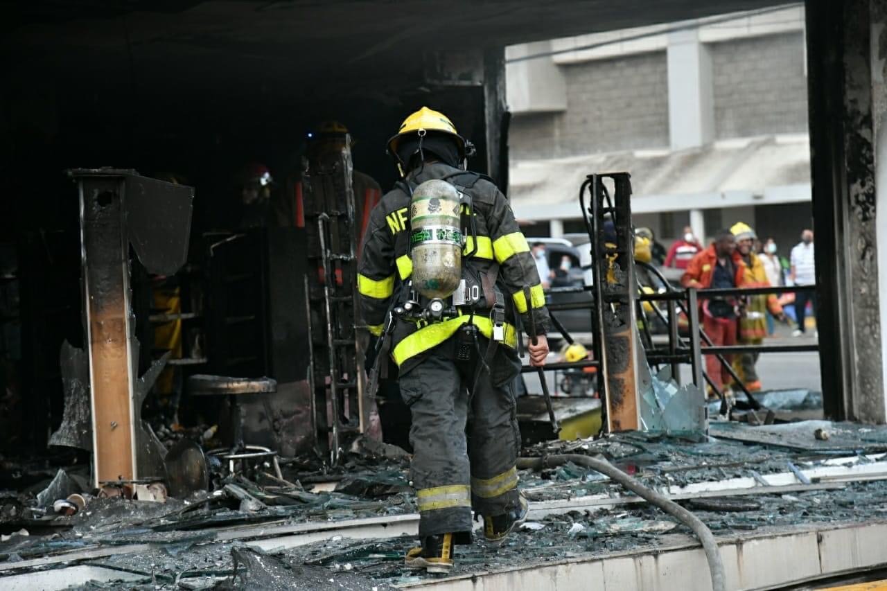 Personal del Cuerpo de Bomberos del Distrito Nacional trabajaba todavía esta noche en el lugar, aunque ya las llamas del fuego habían cesado.